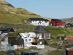 The stone church in the village is from 1856. It is the only octagonal church on the Faroe Islands. The altarpiece is also distinctive. It represents the Last Supper where the Apostles' faces are replaced by the faces of living public figures from the Faroe Islands.
