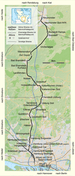 The stations on the current line of A1 between Hamburg Hauptbahnhof and Eidelstedt in the Hamburg urban area were not part of the original route and are served only occasionally by the AKN.