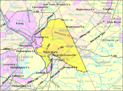 Hamilton Township is a township in Mercer County, New Jersey, United States. The township is within the New York metropolitan area as defined by the United States Census Bureau,[21] but directly borders the Philadelphia metropolitan area and is part of the Federal Communications Commission's Philadelphia Designated Market Area.[22] As of the 2010 United States Census, the township had a total population of 88,464,[10][11][12] reflecting an increase of 1,355 (+1.6%) from the 87,109 counted in the 2000 Census, which had in turn increased by 556 (+0.6%) from the 86,553 counted in the 1990 Census.[23] The township was the state's 9th-largest municipality, after having been ranked 10th in 2000.[24] The township is located immediately east of the city of Trenton, the state's capital.