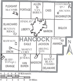 Hancock County was established on January 21, 1828, by the Ohio General Assembly from the southern portions of Wood County. Originally containing only Findlay Township, the county would add Amanda and Welfare (now Delaware) townships later in April of that year. Additional townships were laid out as follows: Jackson in 1829; Liberty and Marion in December 1830; Big Lick, Blanchard and Van Buren in 1831; Washington, Union, and Eagle in 1832; Cass and Portage in 1833; Pleasant in 1835; Orange in 1836; Madison in 1840, and finally Allen in 1850. Originally nearly 24 miles square, Hancock County would lose some of its southeast portion in 1845 to the new Wyandot County.[5]