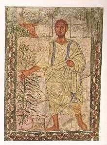 The largest group of Jewish imagery from the ancient world, the 3rd century synagogue at Dura-Europas, has the hand of God in five different scenes, including the Sacrifice of Isaac,[3] and no doubt this was one of the many iconographic features taken over by Christian art from what seems to have been a vigorous tradition of Jewish narrative art. Here and elsewhere it often represents the bath Kol (literally "daughter of a voice") or voice of God,[4] a use also taken over into Christian art.