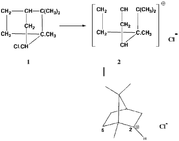 His greatest impact upon organic chemistry was to propose the carbocation 2 as a reactive intermediate, originally as a rationalization of the racemization of isobornyl chloride 1 catalysed by a Lewis acid such as SnCl4. His proposed mechanism for racemization involved a subsequent [2,6] hydride transfer, which allows the carbocation to be located at either of these two symmetric positions. An alternative mechanism—a [1,2] methyl migration, a type of reaction now known as a Wagner–Meerwein shift—was in fact suggested for the first time by Josef Houben and Pfankuch.[2]