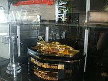 The Harley J. Earl Perpetual Trophy, the "official" version of the award, is housed at the Daytona International Speedway. It stands about four feet (1.2 m) tall, five feet (1.5 m) wide and is in the same triangular "tri-oval" shape of Daytona International Speedway. It's removed from its display once a year to appear in victory lane with the winner of the Daytona 500.[7] In 2010, the trophy was removed from the Daytona International Speedway, transported to the Indianapolis Motor Speedway and put on display alongside the Borg-Warner Trophy – awarded to the winner of the Indianapolis 500 – in the Indianapolis Motor Speedway Hall of Fame Museum during the Indianapolis 500 race week.[8]