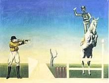 Sea, Koga's most famous work first appeared at the 16th Nika Exhibition in 1929. It contains various motifs which Koga had copied from magazines and post cards. Koga continued to paint in this photomontage-style with the Asahi Graph becoming the most common source of motifs.[2] Other notable Koga photomontage-style works are Makeup Out-of-Doors and Intellectual Expression Traversing a Real Line. In 1929 the work Innocent Moonlit Night was also first exhibited. This colorful work displays the influence of Giorgio de Chirico, an influence that would reappear intermittently in Koga's works over the next year years.[2] The years following Sea are generally considered to be the beginning of surrealism painting in Japan.