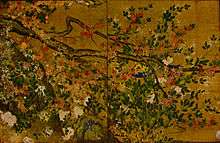 At the same time he also studied the older Song, Yuan and Muromachi periods' styles of ink painting by examining scrolls from Mu Qi and Sesshū Tōyō, which he is believed to have gained access to in his time at the Daitoku-ji temple in Kyoto.[3] After a period of time in Kyoto, Tōhaku developed his own style of Sumie which in many ways departed from the bold techniques indicative of the Kanō school, and called back to the minimalism of its predecessors. The works of Sesshū Tōyō in particular influenced Tōhaku's redirection of artistic style as Tōhaku also studied under Sesshū's successor, Toshun for some time. Tōhaku was in fact so much enamored with the techniques of Sesshū that he attempted to claim rights as his fifth successor, though he lost in a court battle to Unkoku Togan.[1] Still, the influence of Sesshū is evident in many of Tōhaku's mid to late works, such as his Shōrin-zu byōbu (松林図 屏風) Pine Trees screen, which were declared a national treasure of Japan are argued to be the first paintings of their scale to depict only pine trees as subject matter.[1]