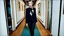 In the various rooms, she meets men wearing vest tops with their faces painted white with black eyes staring at her as she passes down the corridor. Later she meets other people in leather and masks, before being surrounded by a troop of lace-clad dancers. One shot shows a man in colourful clothes and leopard print Speedos surrounded by bubbles in a bathtub. Another room contains a family of four mannequins in a 1960s-styled kitchen, preparing for a plastic-looking meal. A bare African-American is seen dancing and painting herself with a large brush while being almost naked. She is also seen with her legs spread around a TV screen and Beyoncé is seen on it, singing the song. During one scene, Beyoncé performs a dance choreography on a couch along with several other female dancers. Throughout the video, she is seen wearing a tuxedo with a tie, a white fur jacket and platform heels designed by Saint Laurent.[65] The black-and-white jumpsuit she wears is designed by Russian designer Ulyana Sergeenko.[66] Her look is further complete with dark make-up around the eyes and red lipstick while her hair is marcelled and blonde.[67]