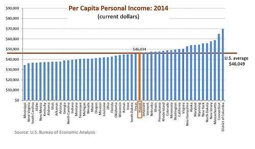 Hawaii has the eighteenth highest per capita income in the United States of America, at $21,525 (2000). Its personal per capita income is $46,034 (2014).[1] The information is represented in the table below.