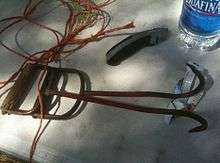 For storage, the bottom tiers of the hay bales are sometimes stacked by a machine called a harrowbed, and the hay bucks brought in to "top off" the stack. The workers generally wear chaps to protect their legs and use hay hooks, long metal hooks with wooden handles, to secure the bales and move them. An apparatus known as an elevator is used to move the bales, conveyor belt style, to levels too high to buck them. Workers are usually paid by the ton or by the number of bales. Because the work is so labor-intensive, many farmers have taken to making multiple ton bales that are moved with machines.
