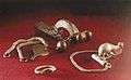 A cross-shaped fibula made of bronze, a silver heart-shaped pendant, a silver jointed fibula(1st – 2nd century), a silver ring with a red rock (2nd – th century).
