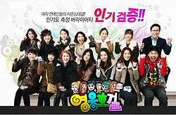 Heroes (Hangul: 영웅호걸; Hanja: 英雄豪傑) was a South Korean variety show; a part of SBS's Good Sunday lineup, along with Running Man. It is classified as a "popularity search variety", where the female celebrities compete to find out which of them is more popular among citizens. It was first aired on July 18, 2010 and ended on May 1, 2011 with a total of 40 episodes aired. Each week, the celebrities are divided into two equal groups of a "Popular" group and an "Unpopular" group (or "Not-So-Popular" group) and must complete certain missions every episode and whoever wins usually get a prize, such as the other team must make dinner for them, they get a hot shower and beds, etc.[1]