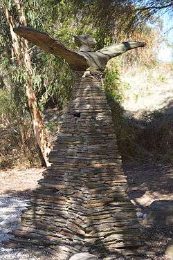 A Hill, a River, Two Rocks and a Presence is a work in timber and stone by Melbourne sculptor John Davis. It was originally made from tree branches, but these became damaged and were replaced by limestone.[4]