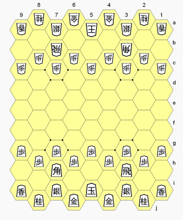 Hexshogi has the same types and numbers of pieces as shogi, and all normal shogi rules apply, including a similar initial setup (see diagram), drops, promotion, check, checkmate, and impasse. As in shogi, pieces capture the same as they move. But the hexagonal geometry implies special move patterns for the pieces.