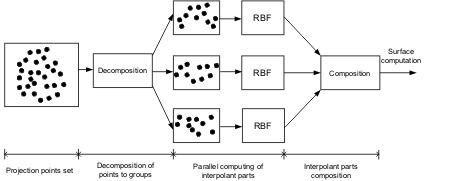 In this case hierarchical division of space containing points on elementary parts, the system of small dimension solves in each of which. The calculation of surface in this case is taken to the hierarchical (on the basis of tree-structure) calculation of interpolant. A method for a 2D case is offered Pouderoux J. et al.[3] For a 3D case a method is used in the tasks of 3D graphics by W. Qiang et al.[4] and modified by Babkov V.[5]