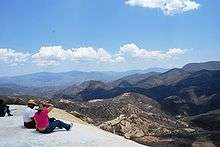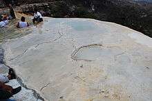 Hierve el Agua (Spanish for "the water boils") is set of natural rock formations in the Mexican state of Oaxaca that resemble cascades of water. The site is located about 70 km east of Oaxaca city, past Mitla,[1] in the municipality of San Lorenzo Albarradas, with a narrow, winding unpaved road leading to the site.[2] The site consists of two rock shelves or cliffs which rise between fifty and ninety metres from the valley below, from which extend nearly white rock formations which look like waterfalls. These formations are created by fresh water springs, whose water is over-saturated with calcium carbonate and other minerals. As the water scurries over the cliffs, the excess minerals are deposited, much in the same manner that stalactites are formed in caves. One of the cliffs, called the "cascada chica" (small waterfall) or the Amphitheatre, contains two large artificial pools for swimming as well as a number of small natural pools.[3][4] One of the artificial pools is very near the edge of the cliff.[1]