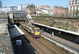 Train arriving at Glasgow High Street. The campus buildings of Strathclyde University are visible at the top of the photograph. | |