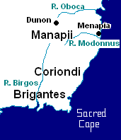 On Ptolemy's mid-2nd century 'Map' of Ireland – dating from c. AD 150[14] – Carnsore point appears as the Sacred Cape, the river Barrow as the Birgos (or Birgus), most of the area of County Wexford is shown as inhabited by a tribe called the Brigantes, and a tribe called the Coriondoi (or Koriondoi) are shown as occupying north County Wexford.[15]