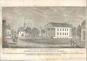 When Norfolk County was formed in 1793 Dedham was named as the shire town and "an influx of lawyers, politicians, and people on county business forced the town to abandon its traditional insularity and its habitual distrust of newcomers."[1] A new county courthouse was built by Solomon Willard, the same architect who built the Bunker Hill Monument. When it was remodeled in 1863 a dome was added, but it was too large and had to be removed. A new dome sits atop the building today.[2]