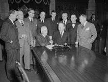 In 1940 Winston Churchill and Franklin D. Roosevelt agreed to an exchange of American destroyers for access to British naval bases in the Atlantic, including Newfoundland. The result was sudden prosperity as American money flooded the island, where 25% of the people had recently been on relief. Some 20,000 men were employed in building military bases. The local and British governments persuaded the United States to keep wages low so as to not destroy the labor force for fishing, logging and other local industries, but the cost of living—already higher than in Canada or the United States—rose 58% between 1938 and 1945.[45] Even more influential was the sudden impact of a large modern American population on a traditional society. American ideas regarding food, hygiene (and indoor plumbing), entertainment, clothing, living standards and pay scales swept the island.[46] As during World War I, Newfoundland became vital to the Battle of the Atlantic. Each month dozens of naval ships protecting convoys stopped at St. John's.[47]
