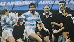 That same year, Los Pumas played the All Blacks, which were in a tour on the country to play a series of matches in October and November. Argentina lost the first match by 33–20. Nevertheless, the national side achieved a historic 21–21 tie on November 2 at Ferro C. Oeste, with all points converted by Hugo Porta. The line-up for that notable match was Diego Cash; Alejandro Cubelli, Fernando Morel; Eliseo Branca, Gustavo Milano; Tomás Petersen, Jorge Allen, Ernesto Ure; Guillermo Holmgren, Hugo Porta (c); Pedro Lanza, Diego Cuesta Silva, Fabián Turnes, Juan Lanza, Bernardo Miguens.[28] Due to those results, some journalists widely regard 1985 as the best year in Los Pumas' history.[29]