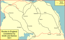 In 1841, Professor Peter Barlow and Sir Frederick Smith had reported on a preferred route for a railway connecting with England; this report had not commanded much compliance. Now in 1844 the Government appointed a commission to recommend a route; once again the presumption was that only one trunk route into England could be supported. The investigation was led by Lord Dalhousie, President of the Board of Trade. It supported the Annandale route, and therefore the Caledonian scheme, and recommended that other lines under consideration should be restricted to local traffic only: the Nithsdale route should terminate at Cumnock, and a proposed Edinburgh to Carlisle scheme (an offshoot of the North British Railway, should stop at Hawick.[1][2]
