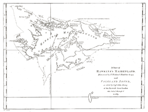 In 1594, they may have been visited by English commander Richard Hawkins, who, combining his own name with that of Queen Elizabeth I, the "Virgin Queen", gave a group of islands the name of "Hawkins' Maidenland". However, the latitude given was off by at least 3 degrees and the description of the shore (including the sighting of bonfires) casts doubts on his discovery.[11] Errors in the latitude measured can be attributed to a simple mistake reading a cross staff divided into minutes meaning the latitude measured could be 50° 48'.[6] The description of bonfires can also be attributed to peat fires caused by lightning, which is not uncommon in the outer islands of the Falklands in February.[6] In 1925, Conor O'Brian analysed the voyage of Hawkins and concluded that the only land he could have sighted was Steeple Jason Island.[6] The British historian Mary Cawkell also points out that criticism of the account of Hawkins discovery should be tempered by the fact it was written 9 years after the event; Hawkins was captured by the Spanish and spent 8 years in prison.[12]