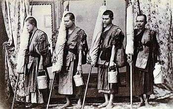 Before studying under Ajahn Kinaree extensively, Ajahn Chah wandered dhutanga from 1946-1954, accompanied by his friend Pra Tawan.[40] Ajahn Jayasaro notes that they wandered in "the traditional manner of the wandering mendicant or tudong monk, carrying their iron bowls in a cloth bag on one shoulder and their glots on the other." They usually walked single file for fifteen miles a day, and the end of the day find a stream to bathe in, set up their glot umbrella tents under trees nearby, and practice meditation at night.[41]