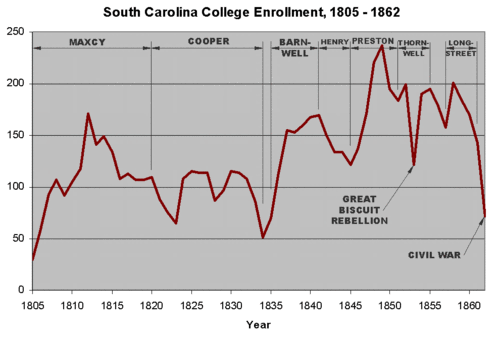 With the generous support of the General Assembly, South Carolina College acquired a reputation as the leading institution of the South and attracted several noteworthy scholars, including Francis Lieber, Thomas Cooper, and Joseph LeConte. However, the college suffered greatly and lost most of its prestige when it closed during the American Civil War.