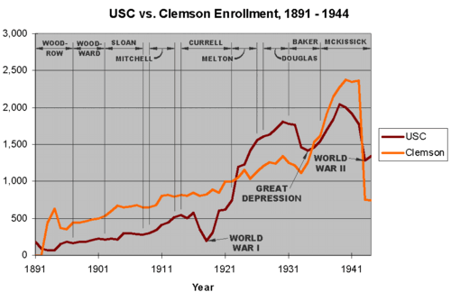 After World War II, enrollment at the University swelled from the influx of veterans. They were wholeheartedly welcomed by President Smith who actively campaigned for their attendance and he announced that every qualified veteran would be admitted to the University. The vast majority of South Carolina veterans chose to attend the University because of its hospitable atmosphere, but also for other reasons. They did not want to attend Clemson or The Citadel because "the prospect of returning home to attend a military college was distasteful for the older men leaving the military after fighting the largest war in world history."[15] In addition, Clemson's rural location and its self-imposed restriction on the number of students made it inaccessible for a large number of veterans. The University offered several special programs to meet the needs of the veterans and it continued an accelerated calendar until 1949. It was at this point in history that the two universities switched reputations and missions. Carolina became known as the university for the common man and an institution accessible for all whereas Clemson settled into a status of elitism.[15]