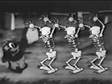 ![]() Uncle Tom is terrorized by skeletons in a scene reminiscent of Walt Disney's 1929 film The Skeleton Dance. | |