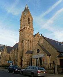 John Wills, a prolific designer of buildings for Nonconfirmist communities, was asked to design a permanent church for the congregation.[6] (One of his later commissions was the Hove Methodist Church.)[7] Congreve paid the full cost of construction and also became the church's first treasurer.[8] Building work took place during 1887, and the first service was held on 29 July 1887. Charles Spurgeon, an influential Baptist preacher, was invited, but he could not attend because of illness.[6] He helped in other ways, however: he sent his brother to preach in his place at the inaugural service and selected the church's first pastor; and one of his sons took this role subsequently.[8] The first pastor, Rev. David Davies, served from 1887 until 1907; on his initiative, Gwydyr Mansions—an "elegant" block of mansion flats in the Flemish Renaissance style—[9] were built opposite the church in 1890.[10]