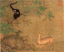 - Sānyuán - In the eleventh century in the Northern Song Dynasty men who scored first in all three levels of the civil service examination were distinguished with the title "Sanyuan" (三元) meaning simply "three firsts." Immediately following the appearance of this term in Chinese literature, the motif of the three gibbons pursuing egrets appears in Chinese painting. In Chinese the scene could be described as "三猿得鹭" (san yuan de lu) a pun on "三元得路" meaning "a triple-first gains one power." Soon, the gibbon became a more generalized symbol, praising those who participated in the civil service exam regardless of whether they achieved three firsts. Thus, the image expresses a wish that its recipient do well on his exams and become successful. Later a variation on the gibbons and egret motif appears through the substitution of deer for egrets. In mandarin the word "鹿" (lù), meaning deer, is homophonous with "鹭" (lù), meaning egret, and so the image achieves the same pun.[20]
