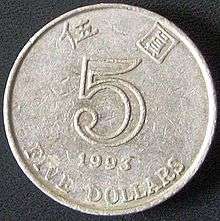 The five dollar coin is the second-highest denomination coin of the Hong Kong dollar. It replaced the five dollar banknotes in 1976.