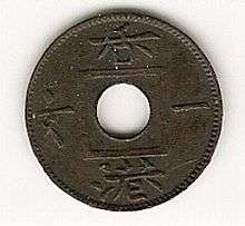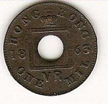 The one mil coin was the smallest denomination of the Hong Kong dollar from 1863 to 1866, after this date it was no longer issued but may have circulated much longer. Its value was one tenth of a cent, or a thousandth of a dollar. Despite being minted under British rule, they did not feature the reigning monarch as all other coins did, due to the hole in the middle.