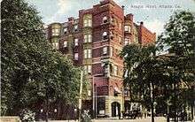 The Hotel Aragon was a six-story, 125-room hotel located 169 Peachtree Street NE, at the southeast corner of Ellis Street in Atlanta, in what is today the Peachtree Center area of downtown. It was a major addition to the city's hotel capacity at its completion in 1892,[1] cost $250,000,[2] and was built and owned by George Washington Collier.[3] It was remarkable at the time as the only major hotel in the city not located adjacent to Union Station. A 1902 guidebook describes the Aragon as one of three chief first-class hotels in the city, together with the Kimball House and the Majestic Hotel.[2]