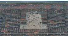 The brief given to John Leopold Denman by the founders was specific: the new church had to be "...unlike a 15th-century church or a Nonconformist chapel or a cinema, but [instead] a modern type of building in keeping with the area".[11] His design has elements of the Vernacular and his favoured[20] Neo-Georgian style, with some elements of Modernism.[27] The 350-capacity[18] church has a single internal space measuring 36 by 24 feet (11.0 m × 7.3 m)[41] lit by small clerestory windows at the top of the aisles. The walls are of "mottled" red brick made at the Ringmer brickworks in East Sussex; the red roof tiles were also produced there.[18] A stubby tower topped with a shallow pantile-covered spire stands at the north end;[27] this has three "startling" bas-relief representations of Saint Christopher, a pelican and a lamb—the latter two representing sacrifice and the Lamb of God.[18] Such allegorical depictions are unusual for a Nonconformist church.[18]