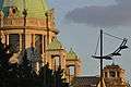 King Peter I took the initiative that to the area near the place where once located a large-Batal mosque, build a building that would serve the purpose as the House of Representatives of the Kingdom of Serbia. The first project of the future House of Representative was made by the architect Konstantin Jovanović in 1891. His plan later was little changed for technical reasons, because of a new state constitution which requires a bicameral instead of the unicameral legislature. In the new competition in 1901, won the second architect, Jovan Ilkić, under whose plan constructed building assemblies. Architect Ilkić was not deviate from the basic version of the plan Konstantin Jovanović. The cornerstone of the House of Representative at a special ceremony was laid in 1907 by King Peter I, in the presence of other members of the royal family, senior officials and the people. The works lasted for almost 30 years, up until 1936. Construction were interrupted on several occasions - due to the two Balkan War, World War I and Great Depression from 1929. The house was completed in 1936 with the first sitting taking place on the 20th of October that year.[1] The building is designed in the neo-baroque style. The building in that time was not been fully completed, because it still needs to work on its interior decoration, up until 1938. For this work he was engaged Russian architect Nikolai Krasnov, who is in every room of the building of 13,800 square meters done project of interior design. Krasnov was designed every detail - chandeliers, lamps, handles, windows, and furniture. His plans were not carried out as a classical technical drawing with a ruler and a pencil, than a watercolor. Lawmakers have not long to enjoyed the newly built House of Representative. After the invasion of Yugoslavia in 1941, the country was occupied, and during period of the Second World War in the House of Representative was located a German High Command of southeastern Europe. The parliament building was damaged during the October fifth demonstrations in 2000. The building is shown on the five thousand Serbian dinar banknote. The parliament building was also featured in the movie Coriolanus (2011).[2]