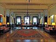 The entrance hall preserves the marble Ionic columns and tile mosaic floors of the original, 1896 Eidlitz design.
