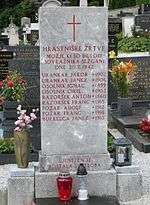 During the Second World War, there was extensive Partisan activity in Hrastnik starting in the summer of 1941. On 20 June 1942, the Partisans held a rally in the village, and the German authorities imposed a curfew on the village. Early on the morning of 20 July 1942, German forces surrounded the village. The young men fled to the surrounding hills, and the troops took eight men to the Vrban barn. Then they looted the village and evicted the women and children, who were sent to various concentration camps. The German soldiers then burned the village, including the barn where the village men were held prisoner. A ninth man, who fled a burning mow, was shot and locked in the burning barn. The soldiers then dynamited the ceramic ovens and cellars of the houses, destroying them completely. The German authorities did not permit the villagers to bury the dead in the Moravče cemetery, and their remains were interred in a mass grave by the village chapel-shrine. The remains were later moved to the Moravče cemetery.[4][6] A monument commemorating the event was erected in the village in 1950.[4][7]