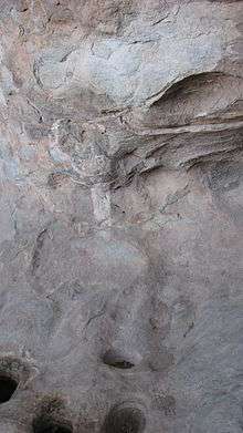 The syenite rock formation is covered with 'desert patina' (visible in the image below), the result of thousands of years of weathering of the rock surface by sun, sand, and water; the site is culturally and spiritually significant to many Native Americans, such as the Mescalero Apache, the Kiowa,[5] the Hopi, and the Pueblo people. This significance is partially manifested in the pictographs (rock paintings) that can be found throughout the region, some of which are thousands of years old. Hueco Tanks contains the single largest concentration of mask paintings by Native Americans in North America, of which hundreds exist at this site.[6]