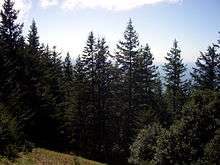 Many types of plants inhabit Humbug Mountain. The most common types of trees include tanoak, Douglas fir, big-leaf maple, Port Orford cedar, and Oregon myrtle.[4][5][9][16] Spruce, alder, and western red cedar can also be found.[17] Smaller plants such as maidenhair ferns, wild rhododendrons, and vanilla leaf are abundant in the area.[4][5][9][16] Wildflowers such as Columbia lilies, trilliums, and bleeding hearts grow in the spring.[4][7][9] Currant, elderberries, blackberries, thimbleberries, huckleberries, and salmonberries are some of the many berries that grow on the mountain.[7]