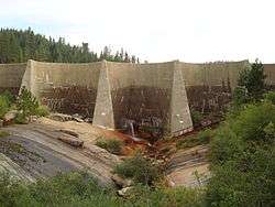 To create this reservoir, John S. Eastwood was hired in 1908 to construct a dam at Long Meadow.[2] Eastwood proposed constructing the world's first reinforced concrete multiple arch dam. Although unprecedented, at a cost of approximately $46,000, the dam's design was a less expensive alternative to a conventional rock fill dam that would have cost about twice as much to construct. The dam was completed in only 114 days, by the end of 1909, along with a mill immediately adjacent to the dam.[3] Logs were dumped into the reservoir by rail and floated to the dam where they were drawn up into the mill, cut and then dried in kilns next to the mill on the west bank of Tenmile Creek. From this location, lumber was floated to Sanger, California, in a flume filled with water from the reservoir. The flume was the longest ever created, eventually stretching 73 miles (117 km) from Hume Lake to Sanger.[4] Designed and built by James Carroll Goss, the flume was used by both the lumber company and tourists. Thrill seeking tourists would occasionally ride in the flume down from the Sierras in special boats designed with an open prow so that water would help keep the boats from flying off into the air. The flume was also reputedly utilized by the murderous bandits Chris Evans and John and George Sontag, who hid along the flume to evade capture.[5]
