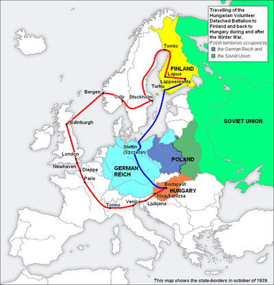 The Hungarian battalion was embarked at Turku on 20 May 1940, from where a steamboat sailed to Stettin, German Reich (now Szczecin, in Poland). In Turku the Order of the White Rose of Finland was given to the Hungarian officers. They travelled across the German Reich by a special train with a German guard. The German government gave them special permission to use the German railway lines in order to reach Hungary. Expenses of the homeward travel were paid by the Finnish Ministry of Defence. The volunteers arrived at Budapest on 28 May. They were welcomed by count Pál Teleki prime minister.