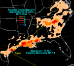 Along the coasts of Texas and Louisiana, the depression produced significant amounts of rainfall, peaking at 11.15 in (283 mm) near Freeport.[18] Several areas in southern Louisiana recorded rainfall exceeding 5 in (130 mm) with a maximum amount of 9.2 in (230 mm) falling in Kinder.[19] Significant rainfall was also recorded in the Carolinas and Georgia, with numerous areas recording over 3 in (76 mm).[18] A maximum of 9.35 in (237 mm) fell near Whitmire, South Carolina before the system dissipated.[20] In all, the depression resulted in an additional $22 million in crop losses in southern Louisiana.[4][21]