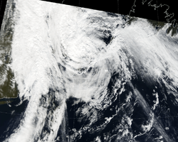 Karen quickly weakened as it moved over cooler waters,[3] and late on October 14 it degenerated back into a tropical storm as it accelerated northward.[4] Convection gradually decreased,[5] and Karen made landfall on southwestern Nova Scotia with winds of 45 mph (70 km/h) on October 15.[1] Karen retained its tropical characteristics during and after making landfall, based on a research flight out of Halifax intended to study the early stages of extratropical transition. The flight reported arced bands and a warm-core system transitioning into a more typical mid-latitude system.[6] Under the influence of a mid-latitude system, the storm turned sharply to the northeast, and after losing the remaining of its convection it became extratropical shortly after landfall. Continuing northward, the remnant low quickly weakened, and dissipated as it was absorbed by a larger extratropical storm over the Gulf of Saint Lawrence.[1]