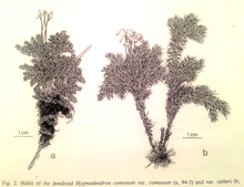 The appearance for both varieties is similar with both sharing many of the same features. Resembling the trunk of the tree, the stems are elongated and narrow growing between 2–9 cm in length. They are black or brown in colour and covered in trichome hairs and small leaves. The stem reaches up to a green umbrella shaped arrangement of fronds at the top. The horizontally spreading fronds are shaped umbellate to pinnate and grow up to 5 cm in diameter. Each spreading frond forms many small branches each reaching 2–5 mm in length. This gives the umbrella shape a clumpy, palm-like look. The branch leaves are triangular-ovate and yellow-green in colour. The costa is green or brown and margins are serrate toward the tip.[9] The sporophyte arises from the centre of the female gametophyte and forms a long seta on which a capsule is borne. H. comosum bares anywhere between 4–12 sporophytes. The seta is long and thin and reaches between 2–4 cm in length. The capsule is orange or brown in colour and reaches around 2–5 mm in length. They are cylindrical in shape. The operculum is the cap or covering to the spores, and once this falls off, the spores are passively dispersed via the peristome.[10] While both species are similar, Hypnodendron comosum var. comosum is unique in that it is the smaller, more compact of the two. Most commonly located in Tasmania, its branches are compactly arranged, making this variety seem clumped and tightly packed. Located on mainland Australia, Hypnodendron comosum var. siberi is taller in form and the branches are much more loosely arranged.[11]