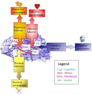 In addition to this "doing" dimension of personality, there is also a "being made" dimension, including the constitutive axes – each one formed of a mental content (which can be cognitive, verbal, motivational, or pragmatic, depending on the personality aspect), a mental and behavioral activity related to it (which can be cognitive, practical, affective, expressive, regulative, or adaptive), and their brain and environmental correlates, respectively.[46] Each constitutive axis consists of two couples: one formed by a brain factor and the corresponding behavior, shaping a mental (memory) content and structuring a "trait" or recurrent behavior, and the other one formed by that mental content and its environmental correlate, generating the specific behavior (functioning).[46] For example, assertive behavior is determined by environmental factors and assertiveness, whereas assertiveness itself is the product of both brain predisposition and assertive behavior. An obsessive-compulsive individual maintains his obsessions (content) if often left alone with his predisposing brain and ritualistic behaviors. A shy person (trait) displays less shy behavior when in a familiar environment. This model provides a picture of the emergent relations between personality structuring, mental functioning (behavior), environment, and biology.[47]