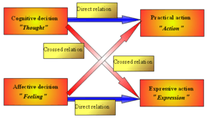In every specific task of daily life, one of the first four dimensions (cognitive, practical, affective, or expressive) is dominant, being at the center of the experience, whereas the other three are subordinated to it. Regulative and adaptive dimensions are constantly acting as a background throughout the behavioral process.[43]