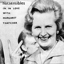 "I'm in Love with Margaret Thatcher" is a 1979 single by the English punk band Notsensibles. It was originally written as an tongue-in-cheek comment on Margaret Thatcher, and following her death in 2013 was part of a social media campaign to get it to number one on the UK Singles Chart.[2] The song charted at number 35 on the chart on 12 April 2013.[3]