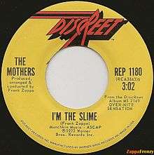 "I'm the Slime" is a 1973 single by Frank Zappa and The Mothers from the album Over-Nite Sensation. Different live versions can be found on Zappa in New York and You Can't Do That on Stage Anymore, Vol. 1 which the version was performed on the same night as the majority of Roxy and Elsewhere. "I'm the Slime" and its b-side version of Montana were put on Zappa's best of Strictly Commercial. It was performed in concert from 1973 to 1977 and 1984.[1]