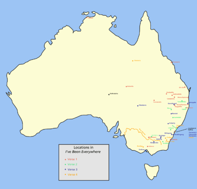 Australian Peter Harris visited all the locations in the Australian version of "I've Been Everywhere" between December 2009 and July 2011. A record of his trip is located here.[17]